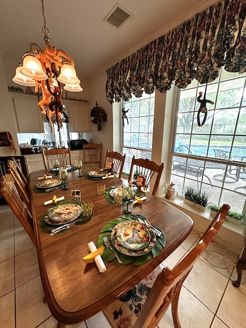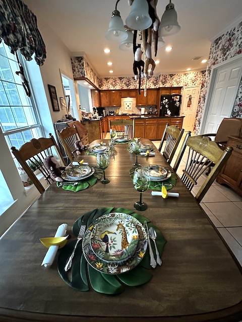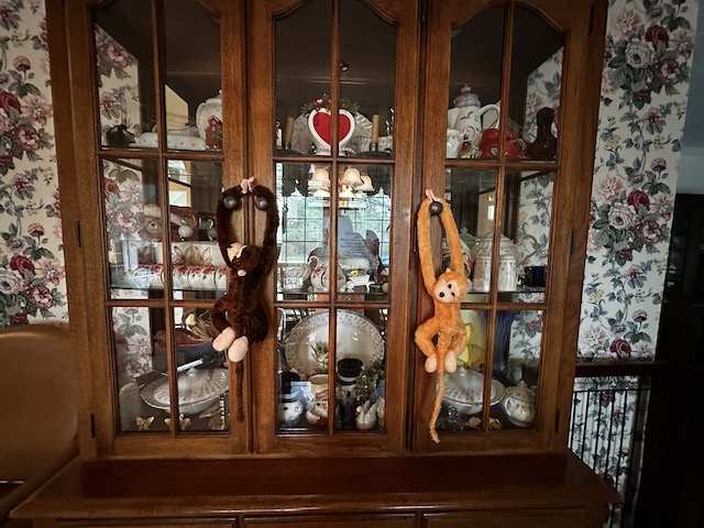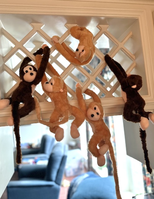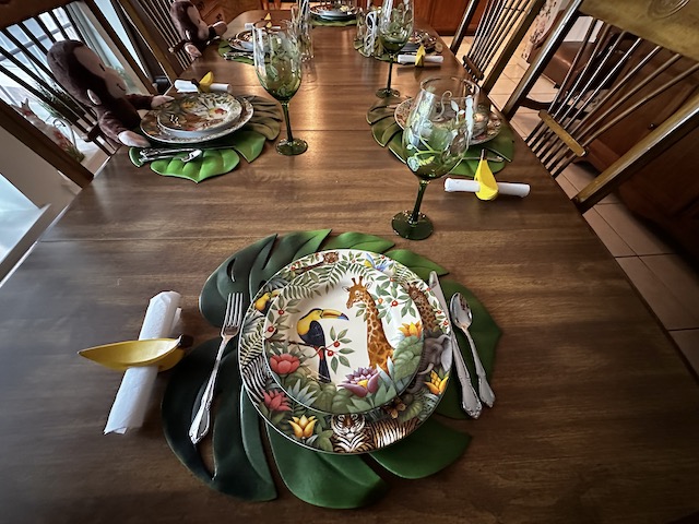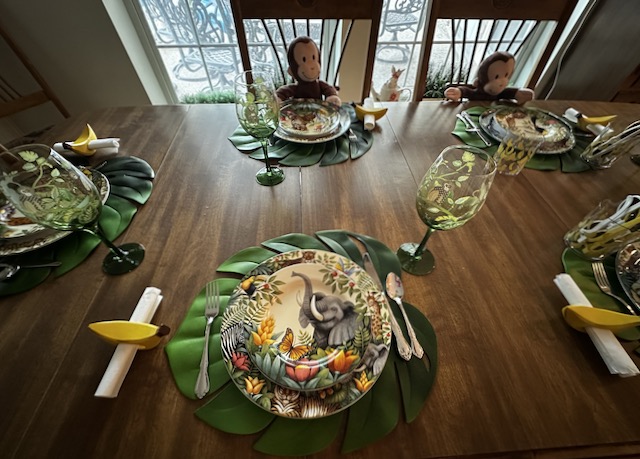 … our friends Susan and Les came to our rescue, offering to help install the car seats (they are current grandparents and understand this generation of car seats.) They also offered to finish the last errand and Susan offered to do the table. Susan often helps me with my tablescapes as she enjoys it, and its is so much fun for both of us to do it together. This time though Susan became to sole tablescaper and Wayne and I zipped off to the airport to pick up our company. So armed with monkeys and safety pins and dishes, etc. Susan created the tablescape and did a fabulous job!!! I especially love her creativity in the placement of the hanging monkeys!!!! Susan is so good at telling stories with her characters!!! Many thanks to Susan and Les!!!!!!!