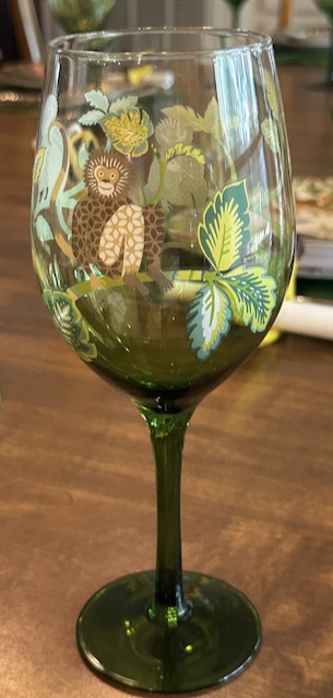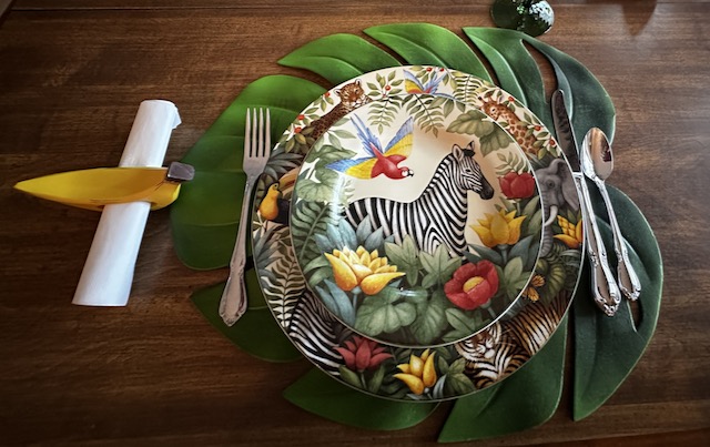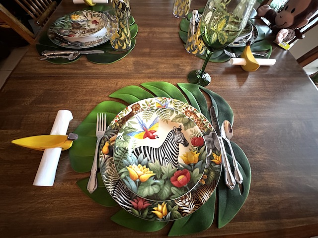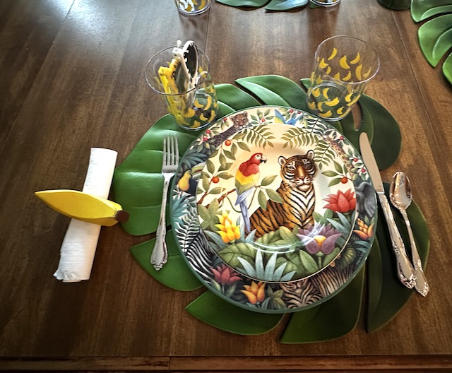 Also in each place setting is a wooden banana napkin ring (with paper napkin) found on eBay and Oneida flatware. Also, there is a glass goblet with monkeys (from Pier 1 years ago) for all the adults.