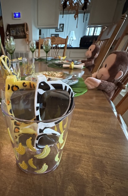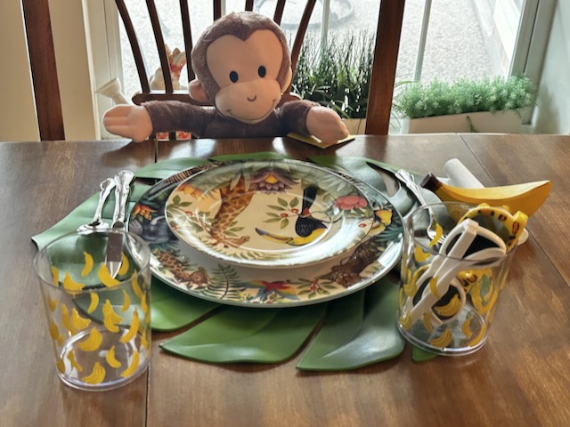 What a fun-themed tablescape for all ages! Love all the unique pieces that make it so interesting! Especially like the banana napkin holder, the monkey goblets, and the banana/themed plastic cups for both beverages and kids sunglasses! Curious George is loved by all!
