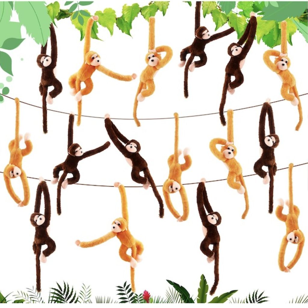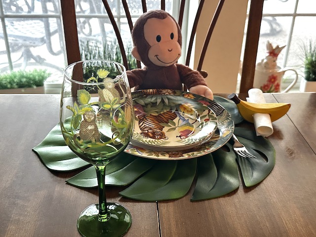 Of course I wanted to make a tablescape that the kids would enjoy, and I started my planning early. My goal was for every item on the tablescape to be something the kids could touch, and for some of the items to be things they could play with and take home. I thought it would be fun to make a jungle tablescape with A LOT of monkeys. After I bought my jungle dishes years ago, I also bought some Curious George “monkey” stuffed animals to use as centerpieces and as decorations hung throughout the room. ( “Curious George” is a character from a children’s book and as a former preschool and elementary teacher, I always like to display Book Character plush toys when I can to celebrate reading.)