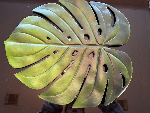 I wanted to keep the tablescape “easy care” as we would be eating almost all breakfasts there and depending on what else we did, and where we went, we would likely eat nighttime snacks and the occasional lunch or supper there as well. For this reason I chose not to use a tablecloth, and I wanted to start my “stack” with a vinyl Tropical Leaf Placemat (from Hobby Lobby).