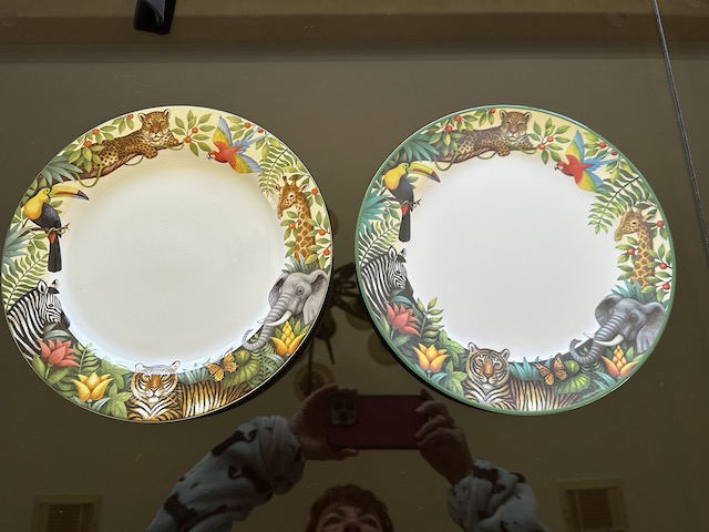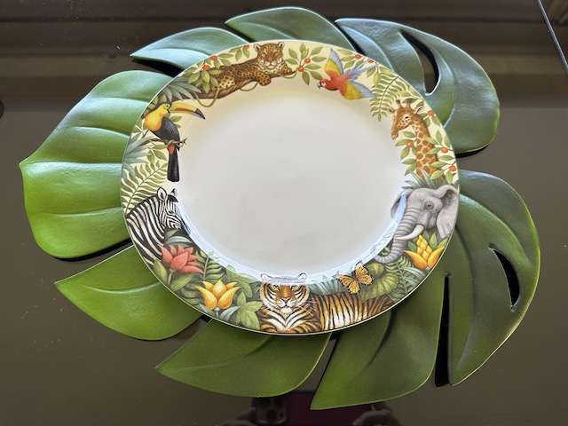 Sakura “Jungle Animals” pattern from Stephanie Stouffer. Ceramic/Ironstone, eBay, search under product and pattern name and “Sakura Jungle plates” on eBay and in other vintage shops. Note, Sakura made 3 or more different jungle patterns over the years, so if ordering on eBay, and if you want the pieces to “match” check both the patterns names and photos carefully.