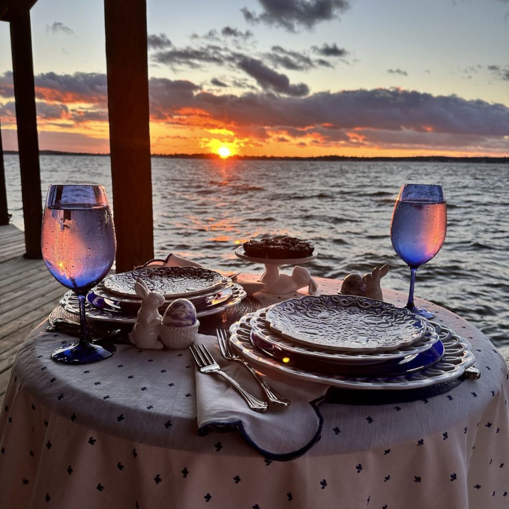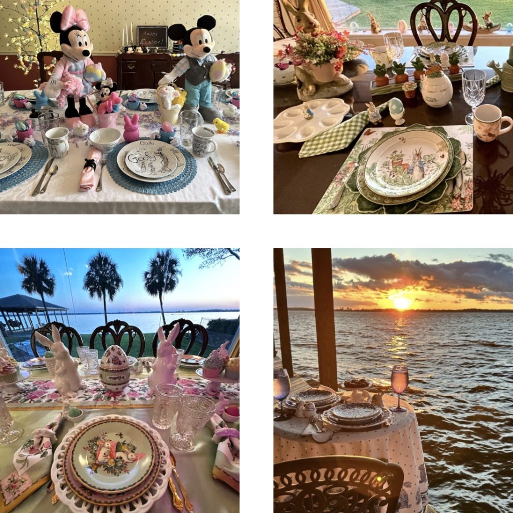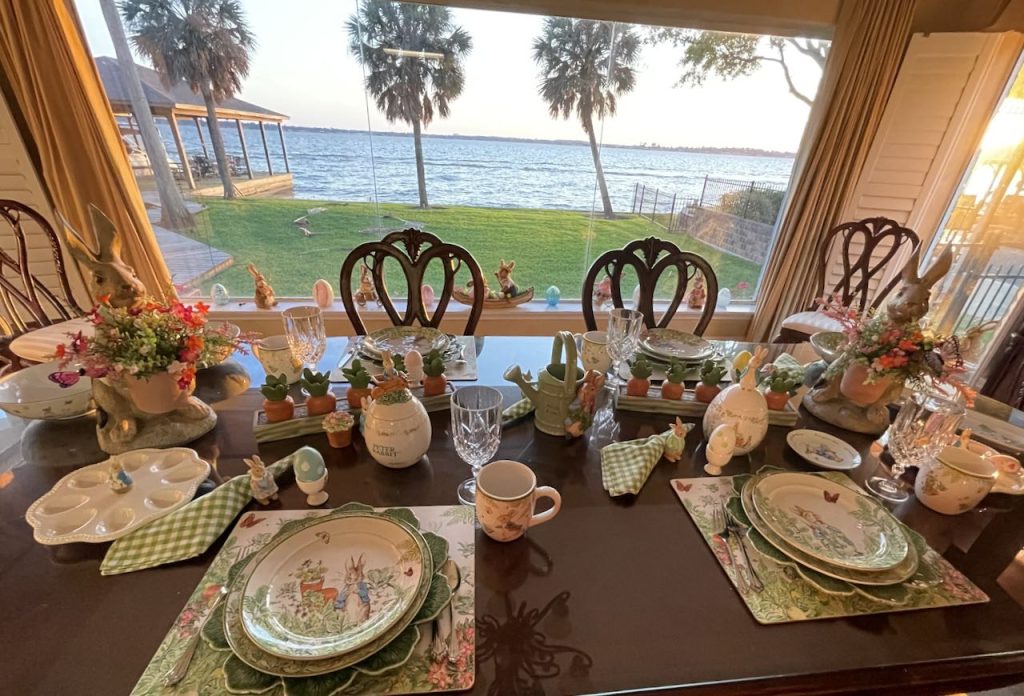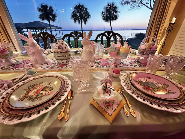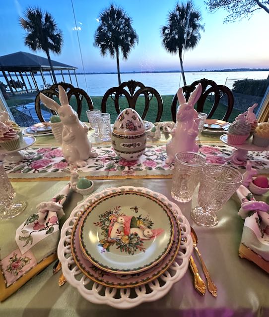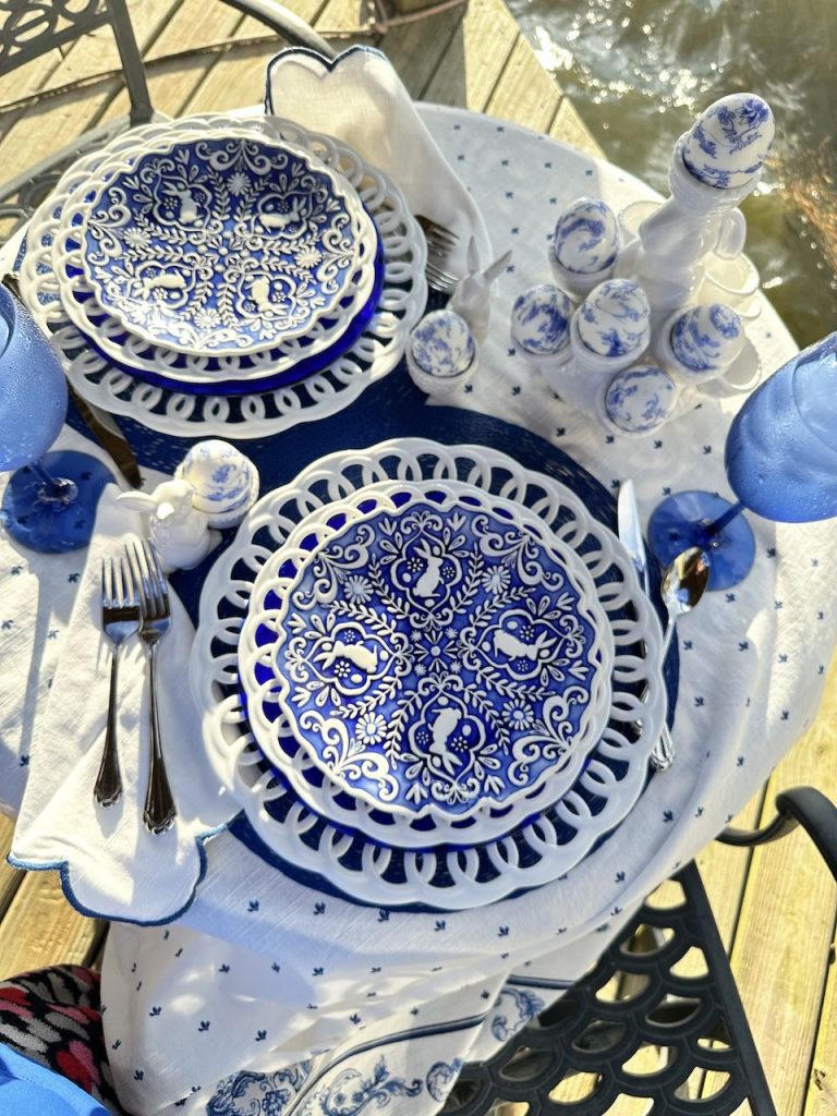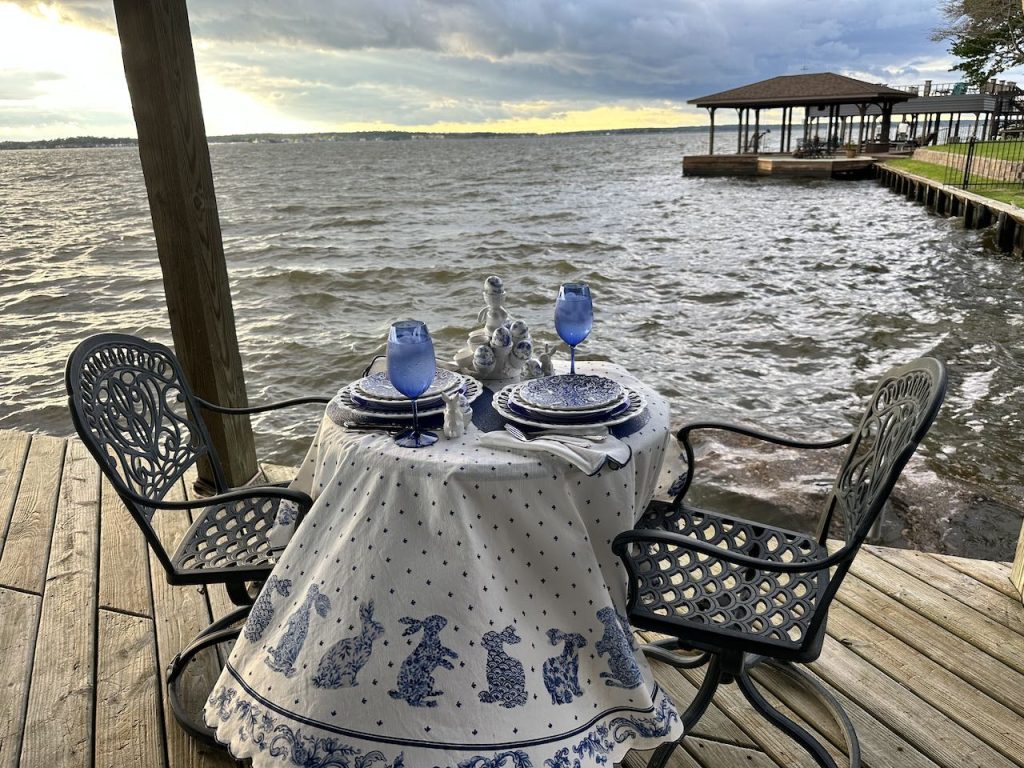 Our “Happy Spring” lakeside Tablescape was originally published on 04-13-2024. It features Blue and White bunny plates, white bunny serving pieces, blue depression glass and the sunset. To see more details as well as more pictures of the table, the lake and the sunset, click on the above title in Blue.