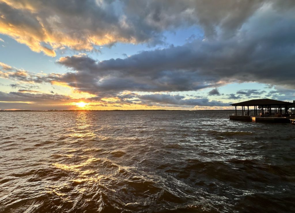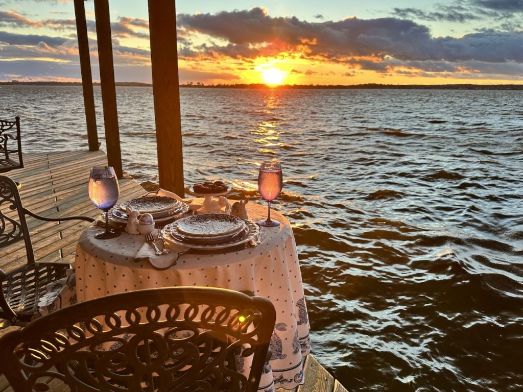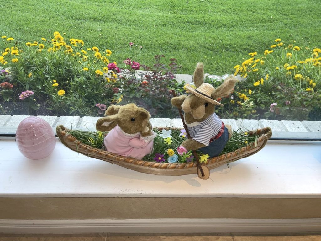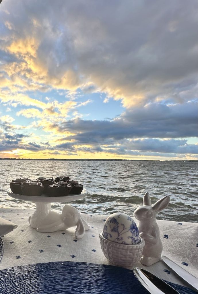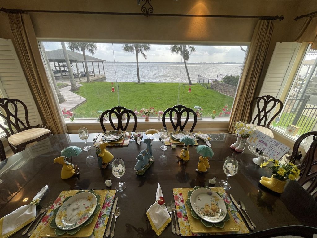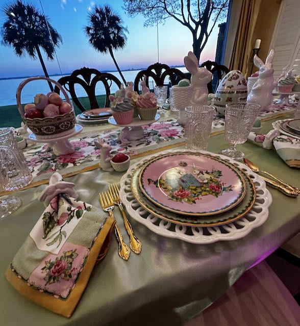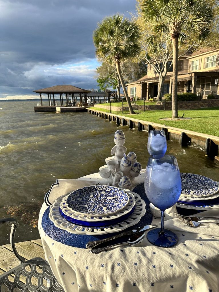 Our “Happy Spring” lakeside Tablescape was originally published on 04-13-2024. It features Blue and White bunny plates, white bunny serving pieces, blue depression glass and the sunset. To see more details as well as more pictures of the table, the lake and the sunset, click on the above title in Blue.
