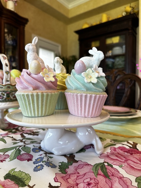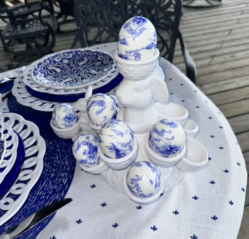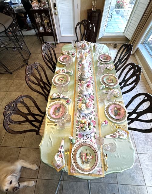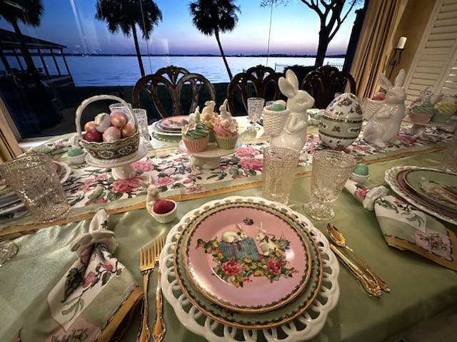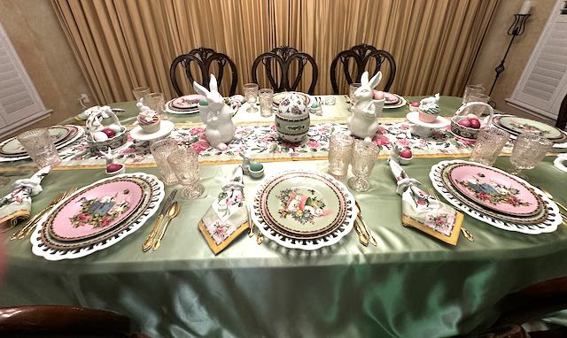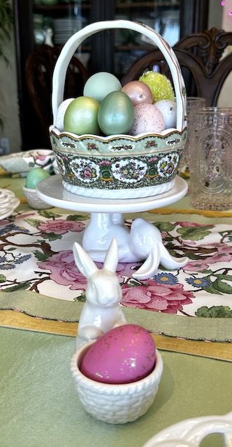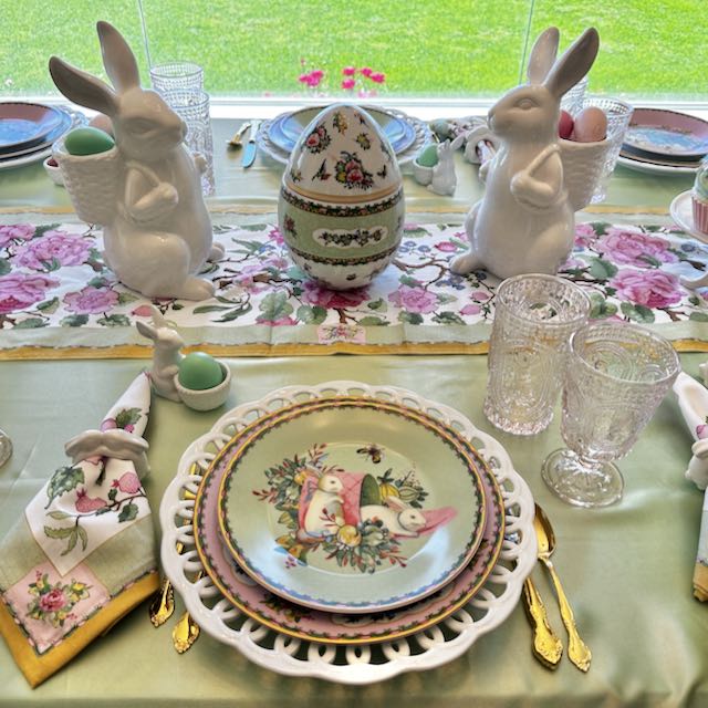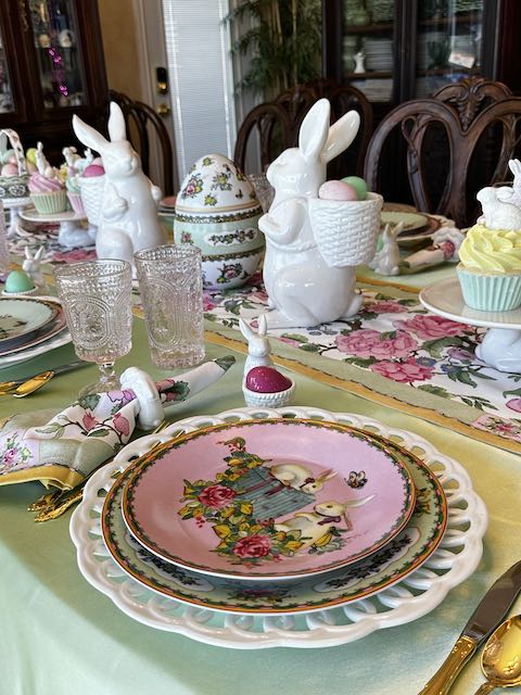 Originally published on 04-14-2025 our “Pink and Green Easter Tablescape with Rabbits and Roses” features Famille Rose dinnerware, white bunnies and pastel eggs. Click on the title above (in blue type) to see the original post including many, many other photos and details.