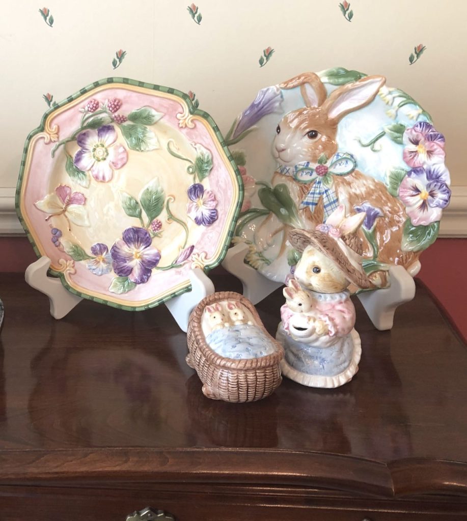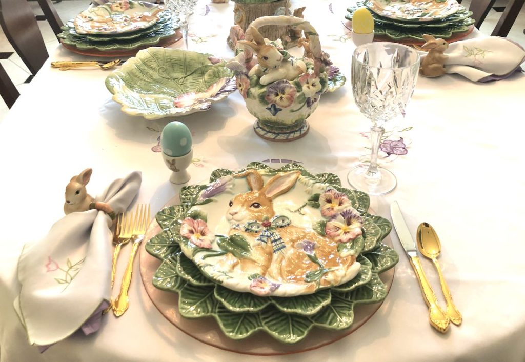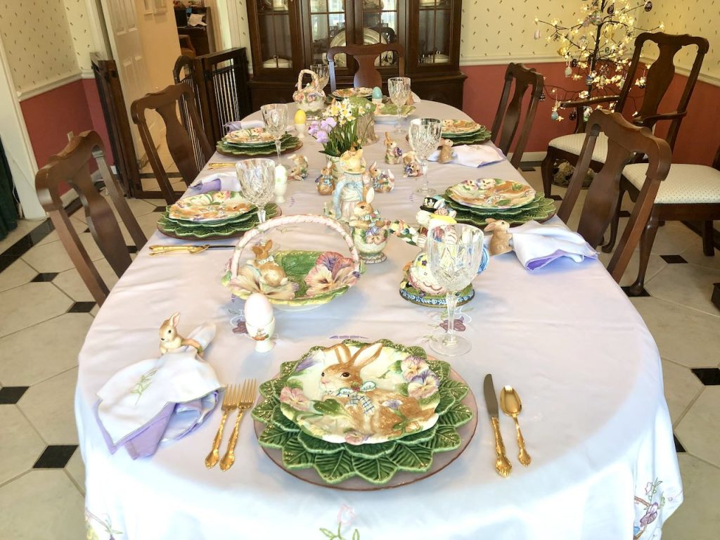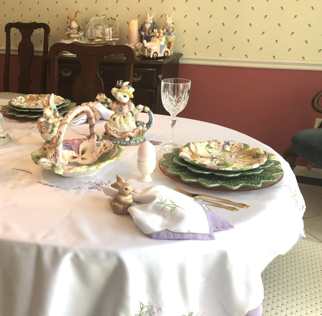 This “Frolicking Fitz and Floyd Bunnies… Tablescape” features Fitz and Floyd Easter Dinnerware and Figurines now retired but often available on eBay and Etsy. To get more information about these items, please click on the Section Title above – in blue type.