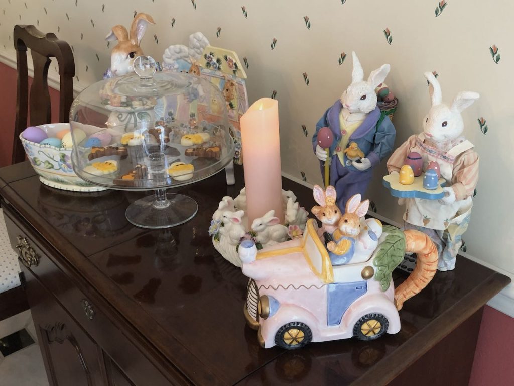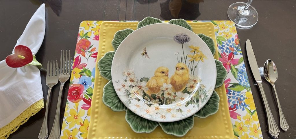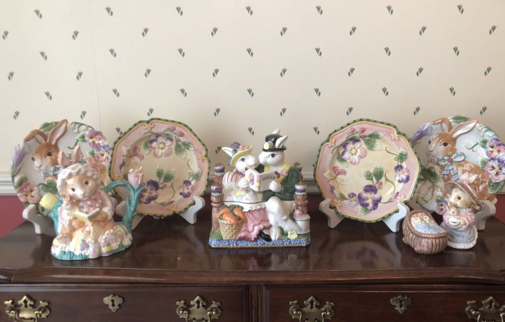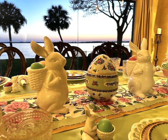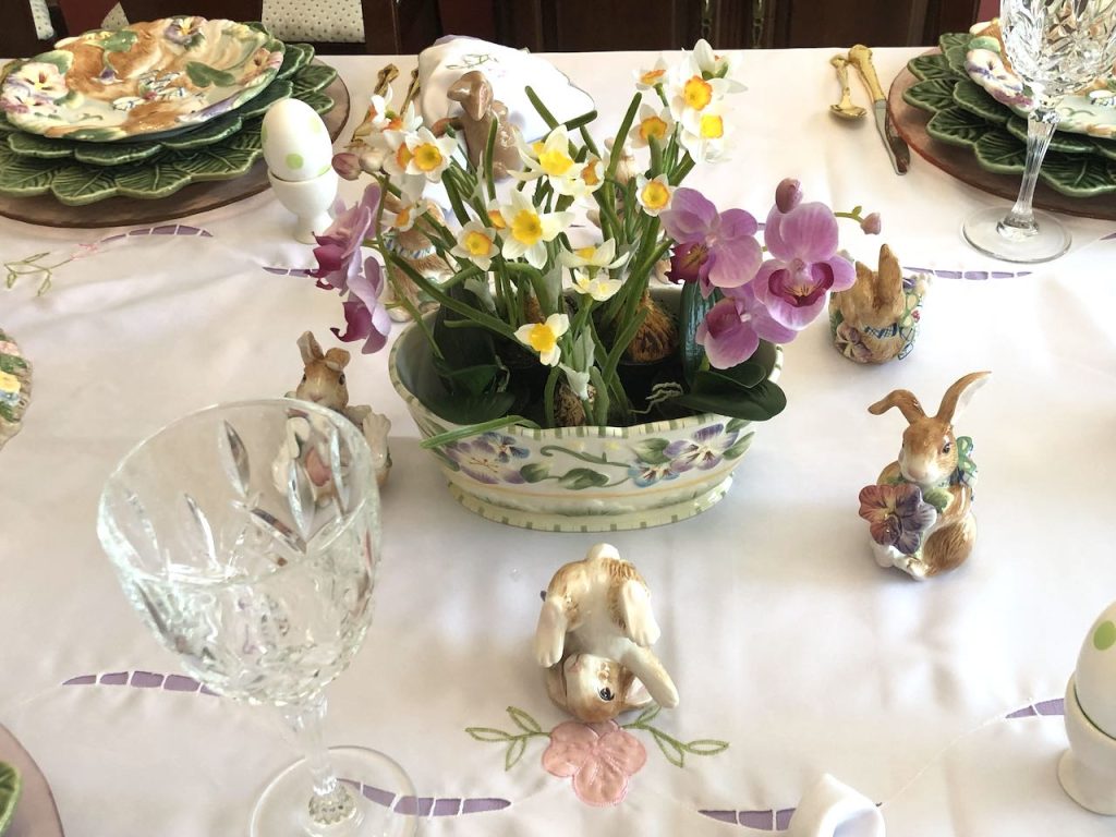 This “Frolicking Fitz and Floyd Bunnies… Tablescape” features Fitz and Floyd Easter Dinnerware and Figurines now retired but often available on eBay and Etsy. To get more information about these items, please click on the Section Title above – in blue type.