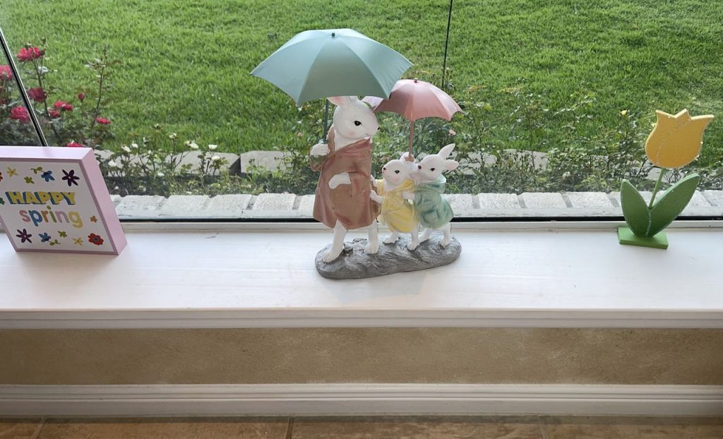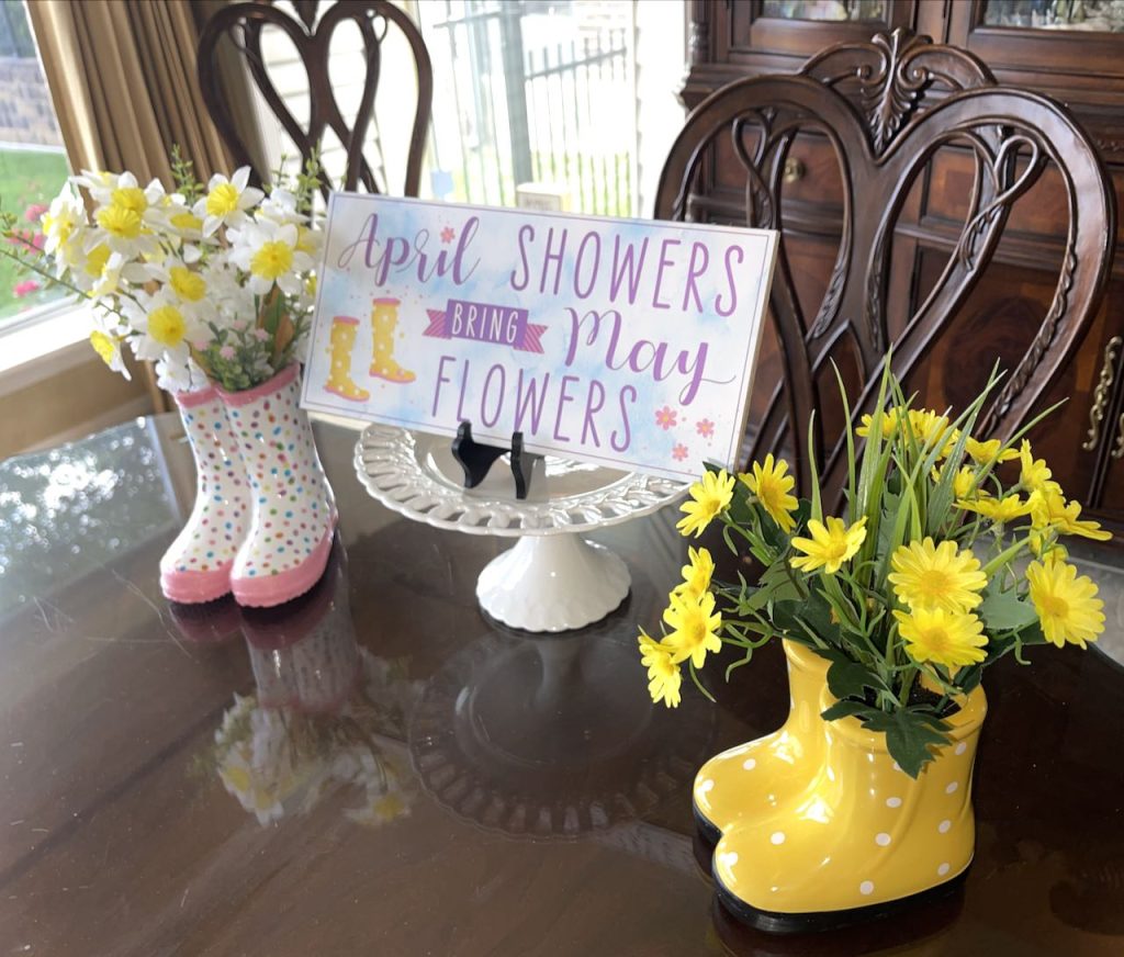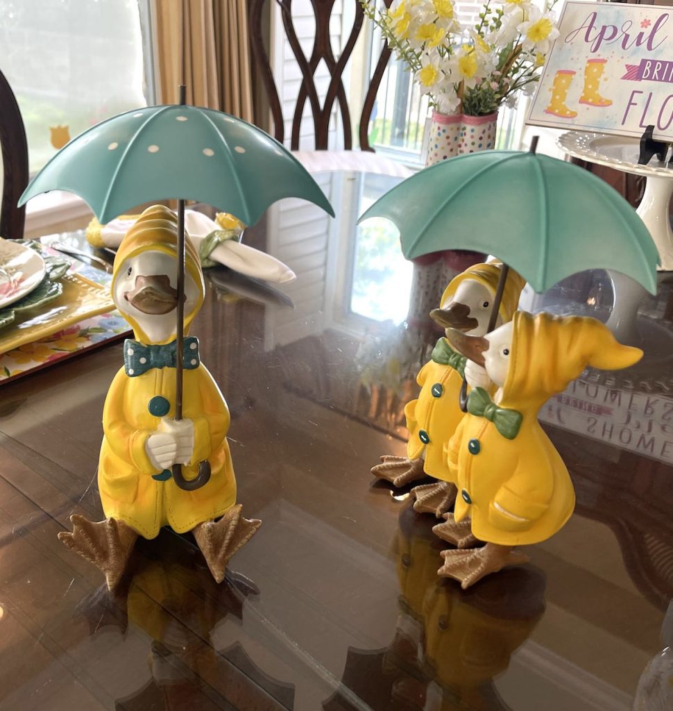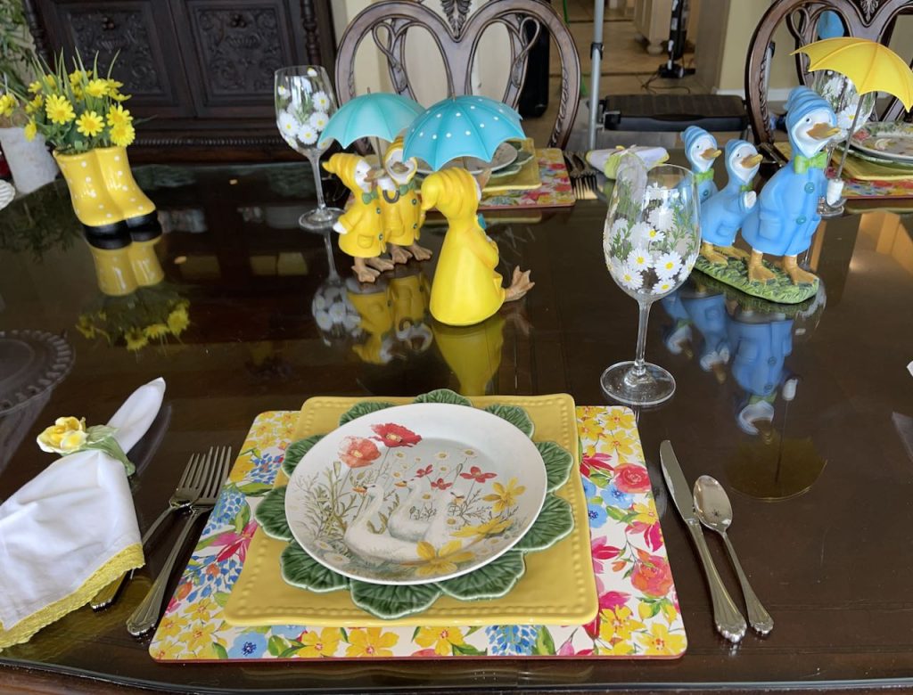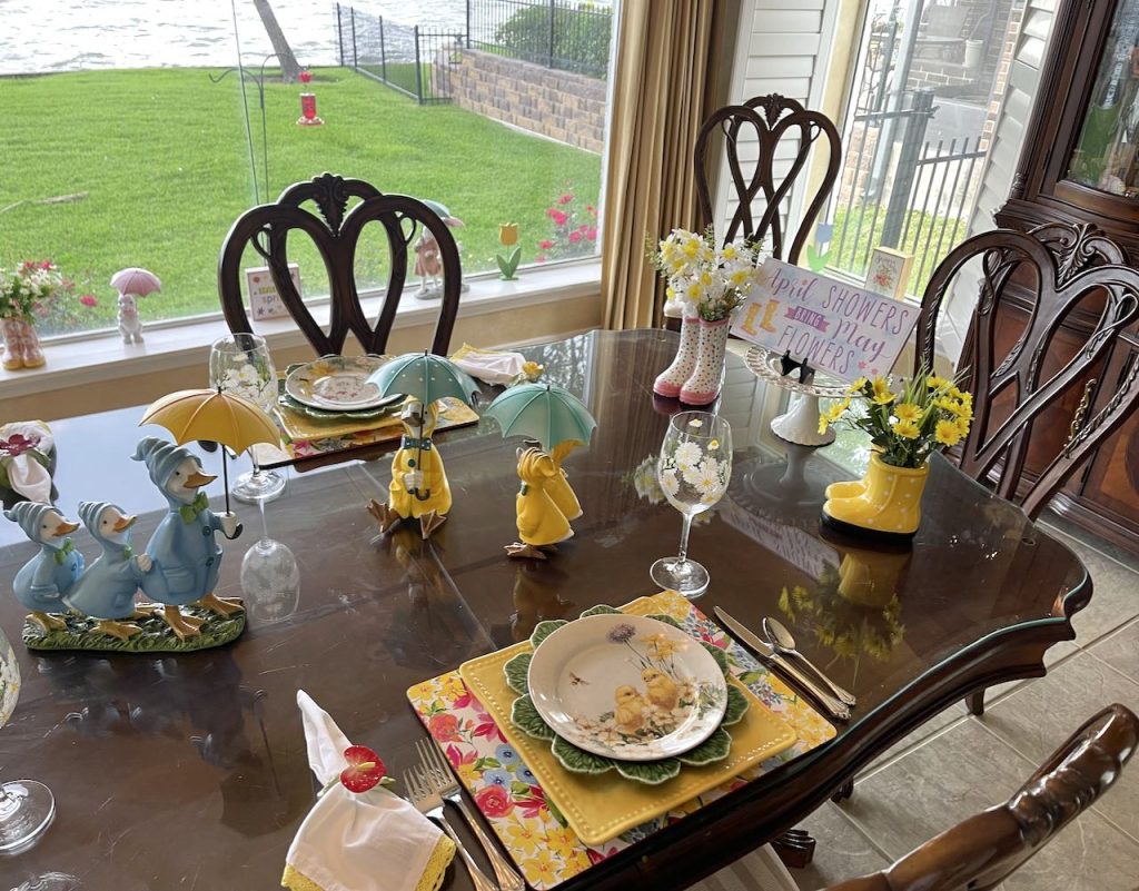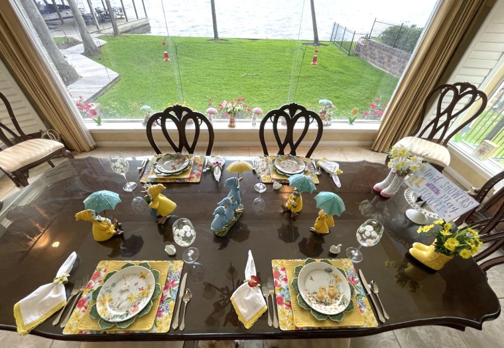 “This April Showers brings May Flowers…” Tablescape features bunny and chick plates and ducks and bunnies holding umbrellas. To see all the items used, and additional pictures please click the title of this section in Blue Type above.